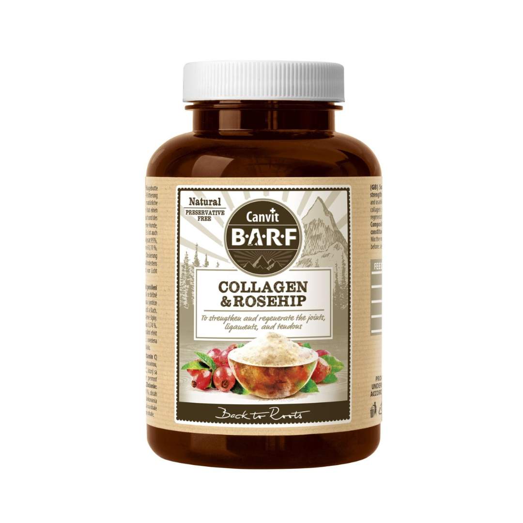 Canvit Collagène & Églantier est une riche source de collagène hautement digestible et de vitamine C issue du cynorhodon, favorisant la synthèse du collagène et le développement des tissus conjonctifs.
