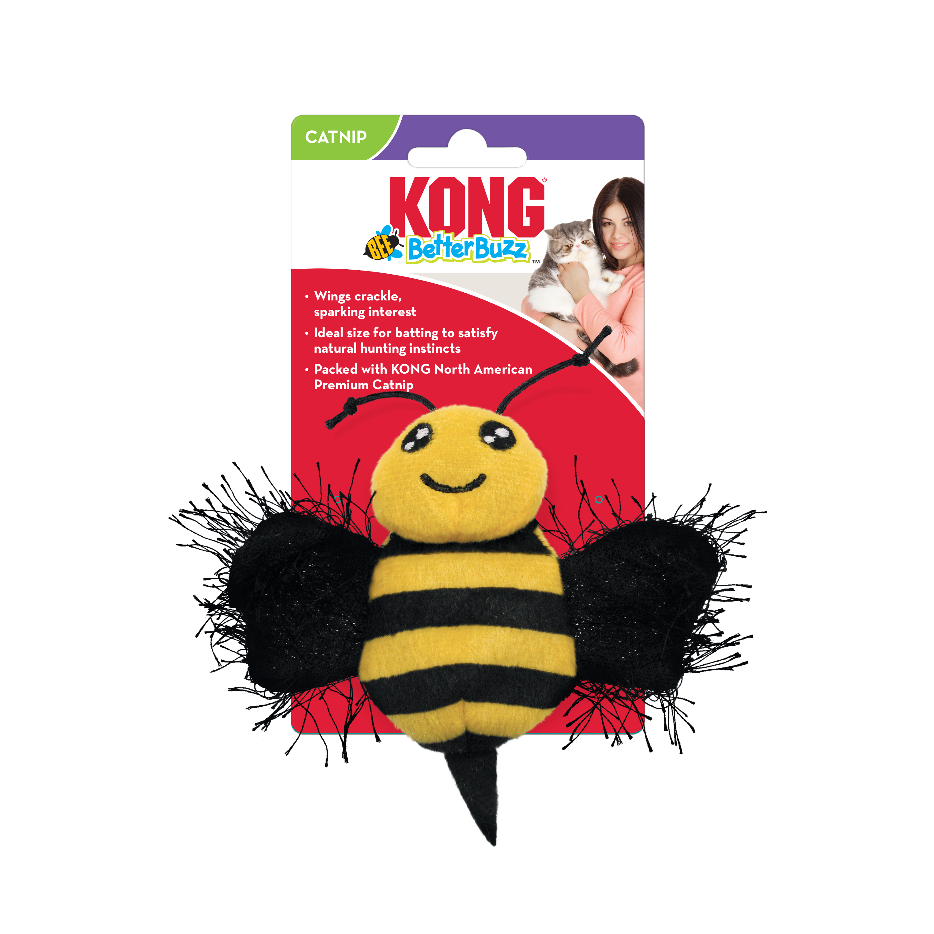 KONG Better Buzz Bee est riche en herbe à chat KONG North American Premium, une herbe à chat puissante qui stimule l'instinct naturel de chat à se battre, à bondir et à chasser. Ses ailes crépitantes, ses antennes élastiques et son pelage flottant captivent les chats pour de plus longues périodes de jeu sain et actif.
