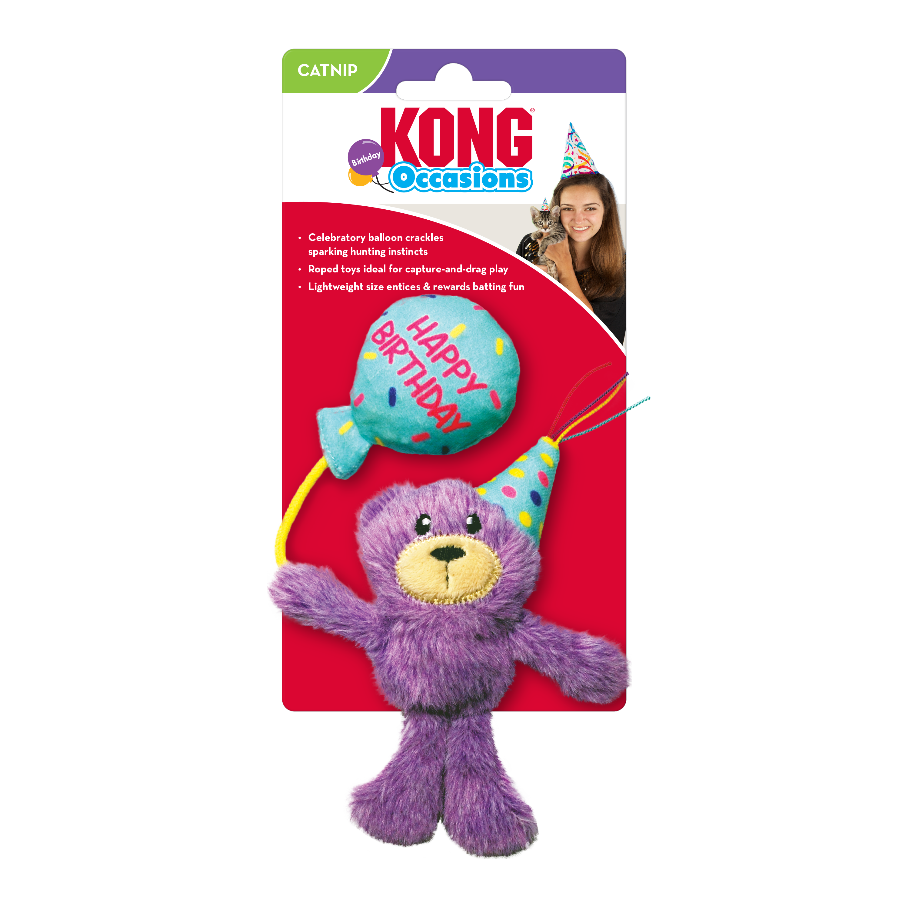 Le jouet KONG Cat Occasions Birthday Teddy facilite les fêtes et invite les chats à jouer grâce à son crépitement qui stimule l'instinct et sa taille légère qui les incite à jouer. Ce jouet est doté de deux cibles souples pour encourager et récompenser le jeu de capture et de traînée. L'herbe à chat nord-américaine KONG Premium prolonge la fête. Idéal pour des moments d'anniversaire conviviaux et conviviaux, si vous parvenez à faire en sorte que le chat fêté s'arrête de jouer et pose.