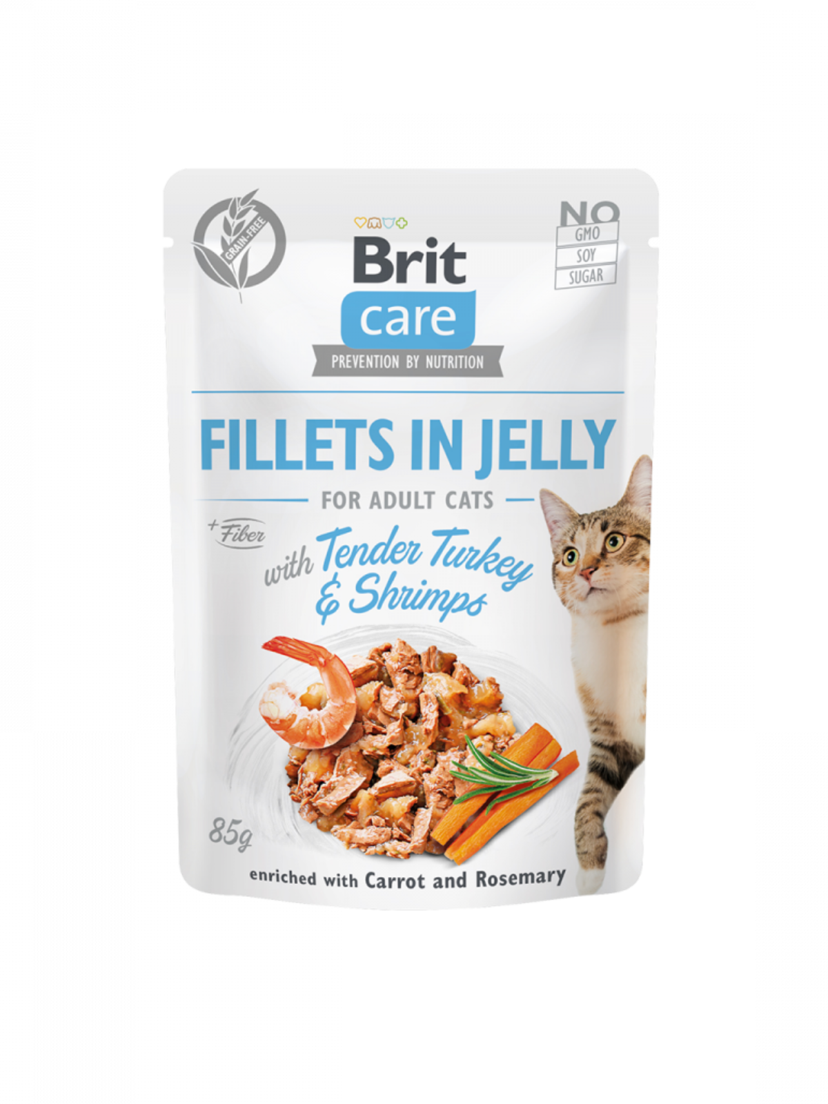Brit Care Cat filets en gelée avec dinde et crevettes. Avec carotte et romarin.