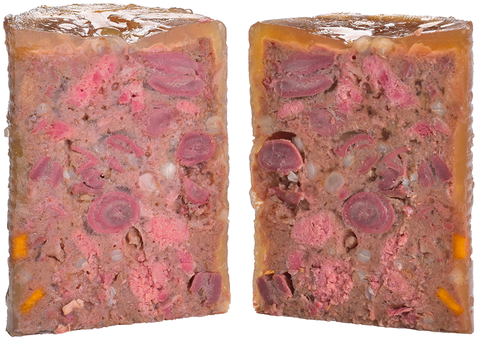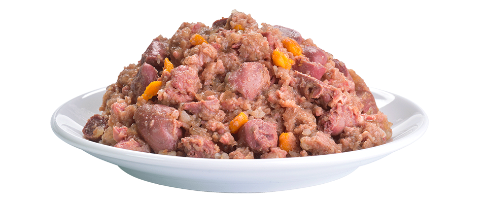 Composition: poulet 48 %, dinde 28 %, bouillon 11 %, patates douces 4,5 %, pommes 2 %, minéraux 2 %, sarrasin 1,3 %, mélange de plantes (romarin, thym, souci, pissenlit) 1 %, huile de saumon 1 %, persil 0,5 %, graines de lin 0,5 %, algues et cassis 0,2 %.
