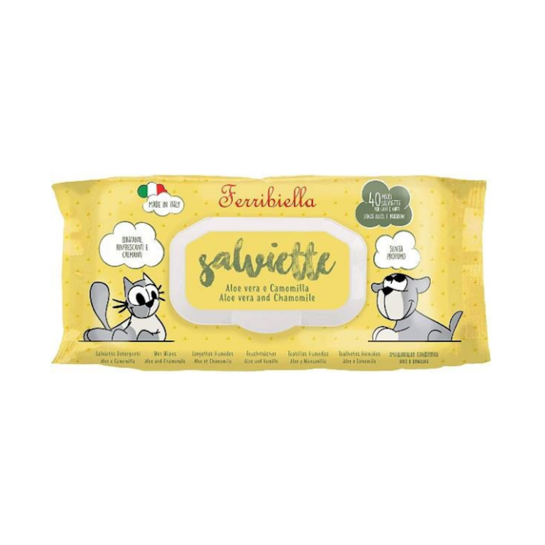 Lingettes humides, au parfum agréable et frais, parfaites pour nettoyer et désodoriser certaines zones du chien à des moments précis : lors de voyages, lorsqu'il revient de la rue, lorsqu'il a fini de manger.