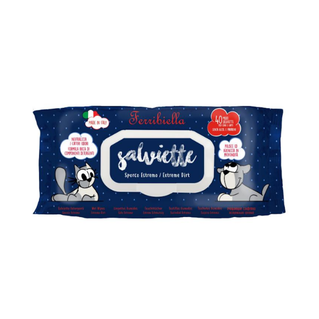 Lingettes humides, au parfum agréable et frais, parfaites pour nettoyer et désodoriser certaines zones du chien à des moments précis : lors de voyages, lorsqu'il revient de la rue, lorsqu'il a fini de manger.
