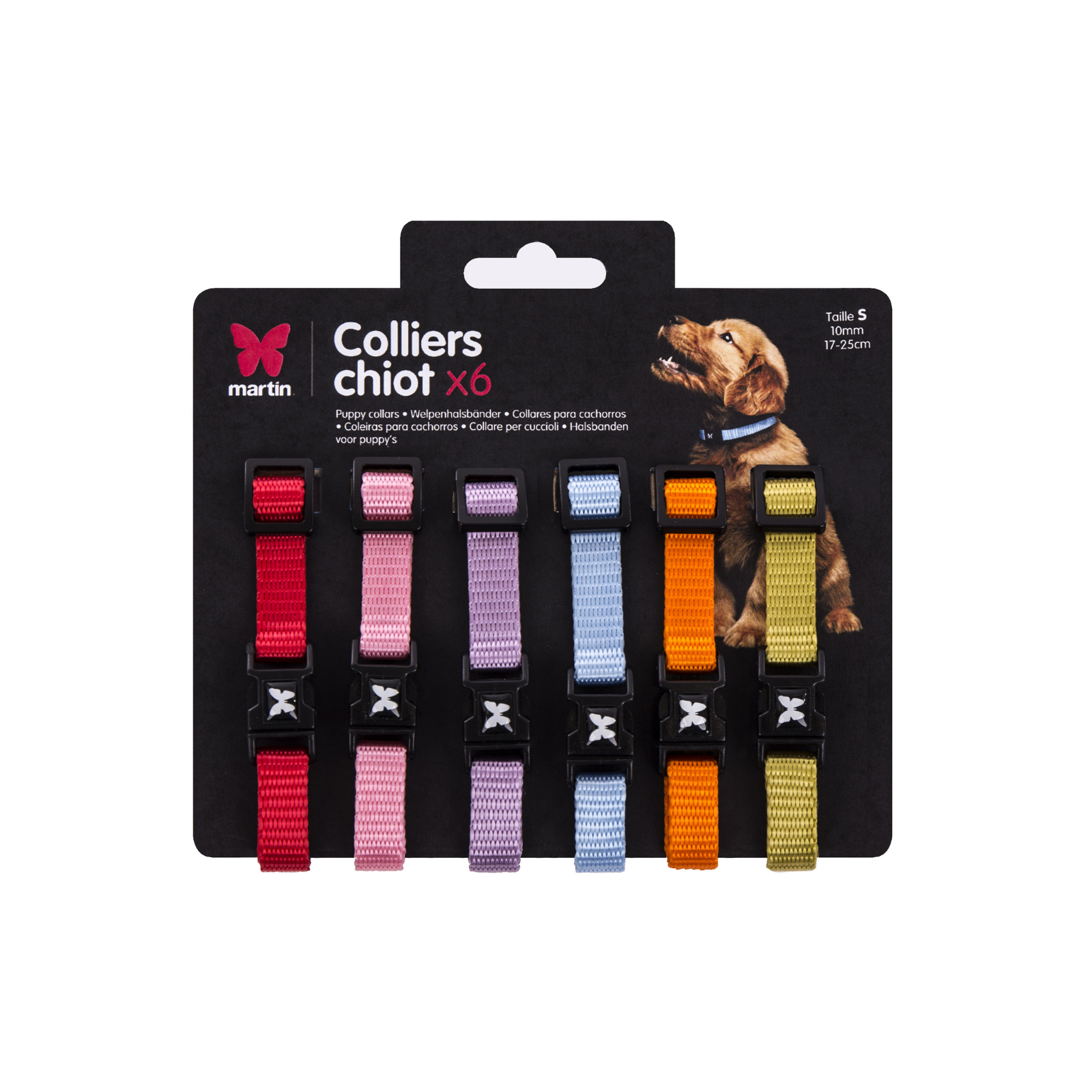 Pack de 6 colliers chiot, coloris bleu, violet, rouge, rose, orange, jaune.